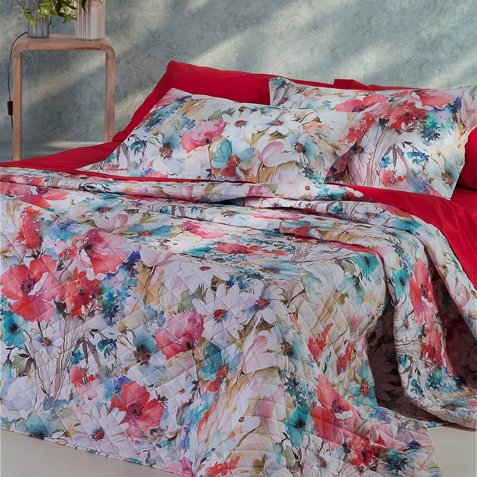Copriletto Trapuntato Mirabello Acquerello di fiori Floreale in Percalle